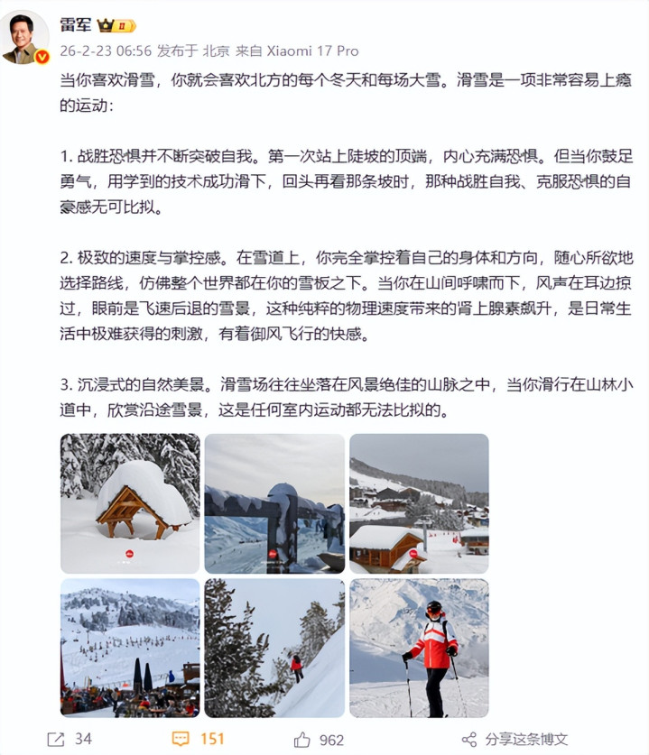 刚放手春节假期的雷军,在微博首度公开我方烂醉滑雪的三大动因,还浮现本雪季的滑行行程已画上句号,行将总结责任节律。为何互联网大佬们总对滑雪情有独钟?这背后藏着怎样的职场与创业逻辑?
