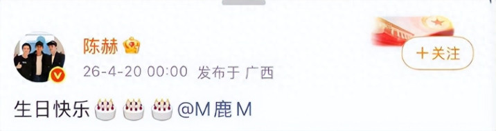 随后陈赫也准点发文为鹿晗庆生:“诞辰自豪@M鹿M”。
