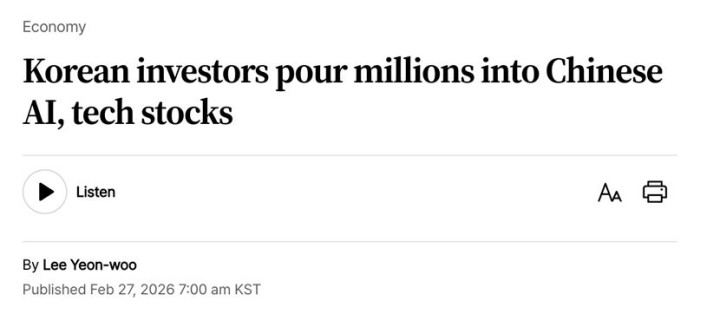 米兰体彩app 韩国投资者加快布局中国AI与科技股 树立暖和握续升温