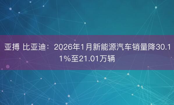 亚搏 比亚迪:2026年1月新能源汽车销量降30.11%至21.01万辆