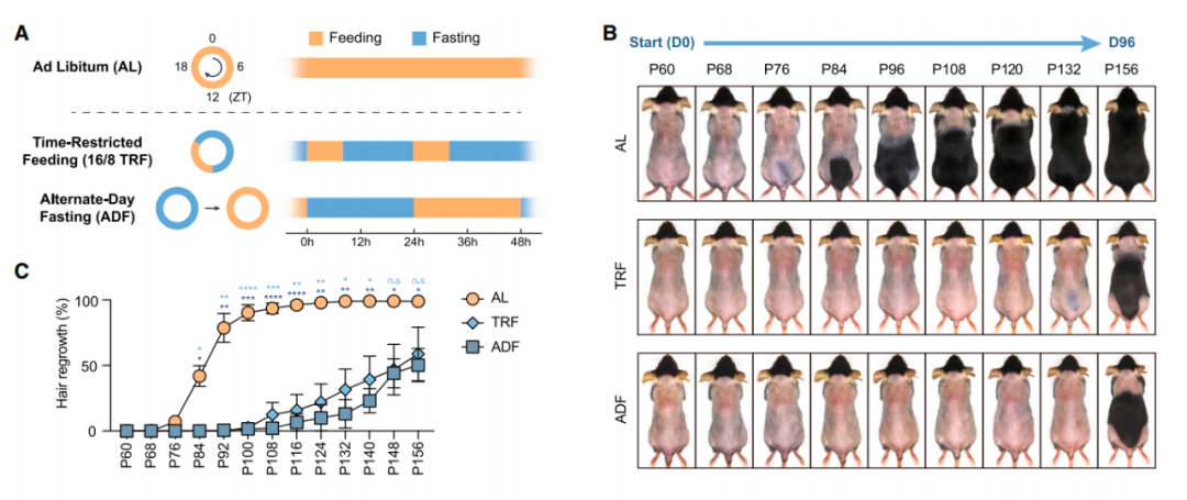 与此同期,商讨团队剃去了这些小鼠的毛发,不雅察不同的禁食模式会如何影响毛发的滋长。