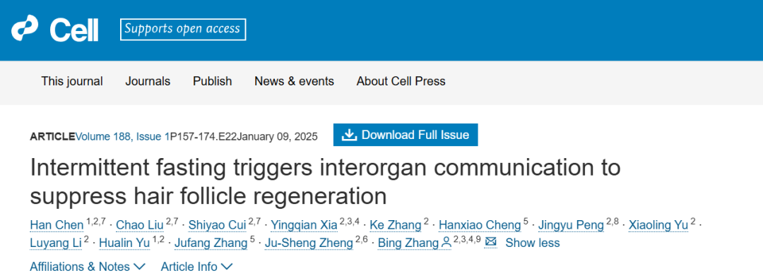 在这个问题上,西湖大学生命科学学院张兵拔擢团队作念出了新的发现,并以《间歇性禁食通过器官间通信防止毛囊再生》为题,在顶尖期刊《细胞》上发表了他们的商讨遵循。