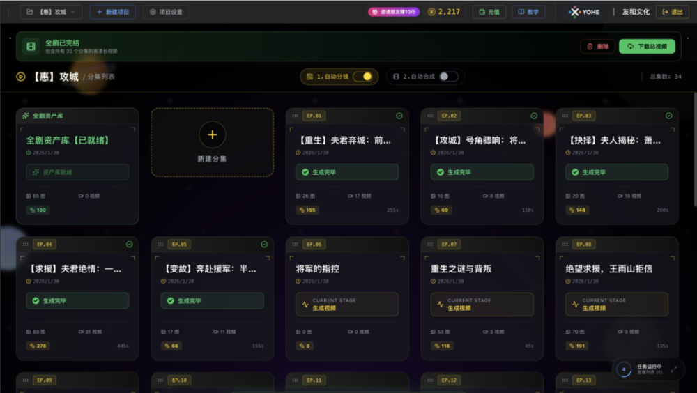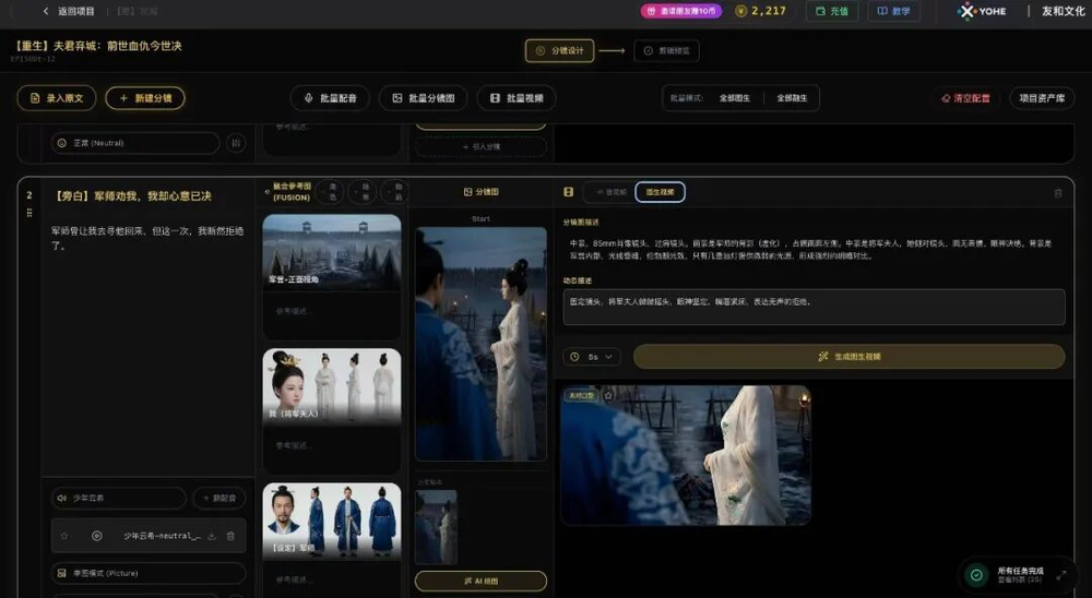 7月份的时候,曹炎忠决定搭建里面的漫剧制作使命流。使命流可以自动把脚本拆因素镜,进行抽卡,生图和视频,自动对口型,出配音。