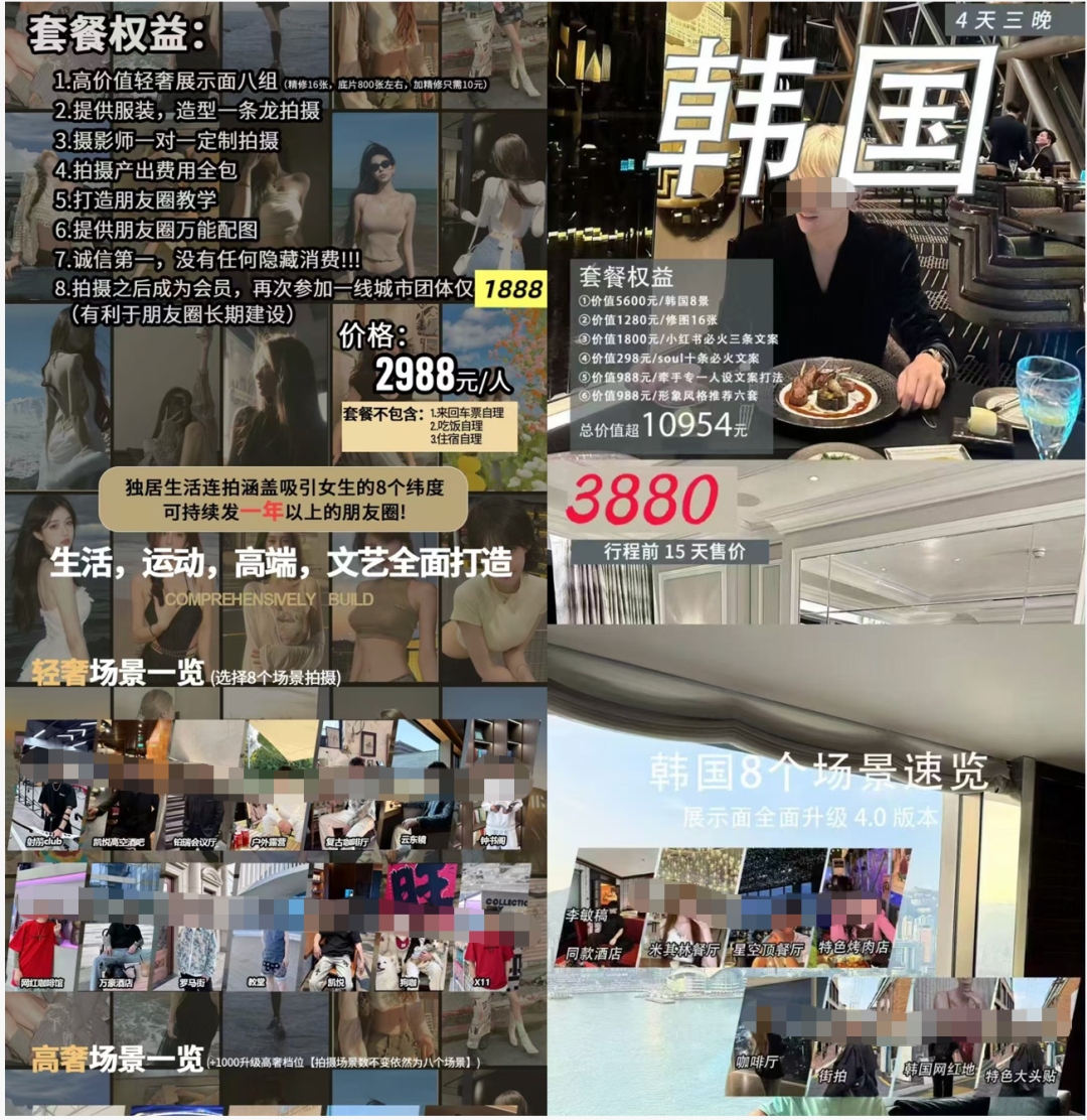 有商家自大当今这个市集很卷,因此赛谈内慢慢分化出一双一定制拍摄、带团去旅游城市和海外拍摄。某位商家提供的报价单自大,去韩国拍摄明星同款栈房、特质烤肉店等售价近4000元/东谈主。此外他们还标的后续去欧洲多国环游拍摄,用度就有点高了。
