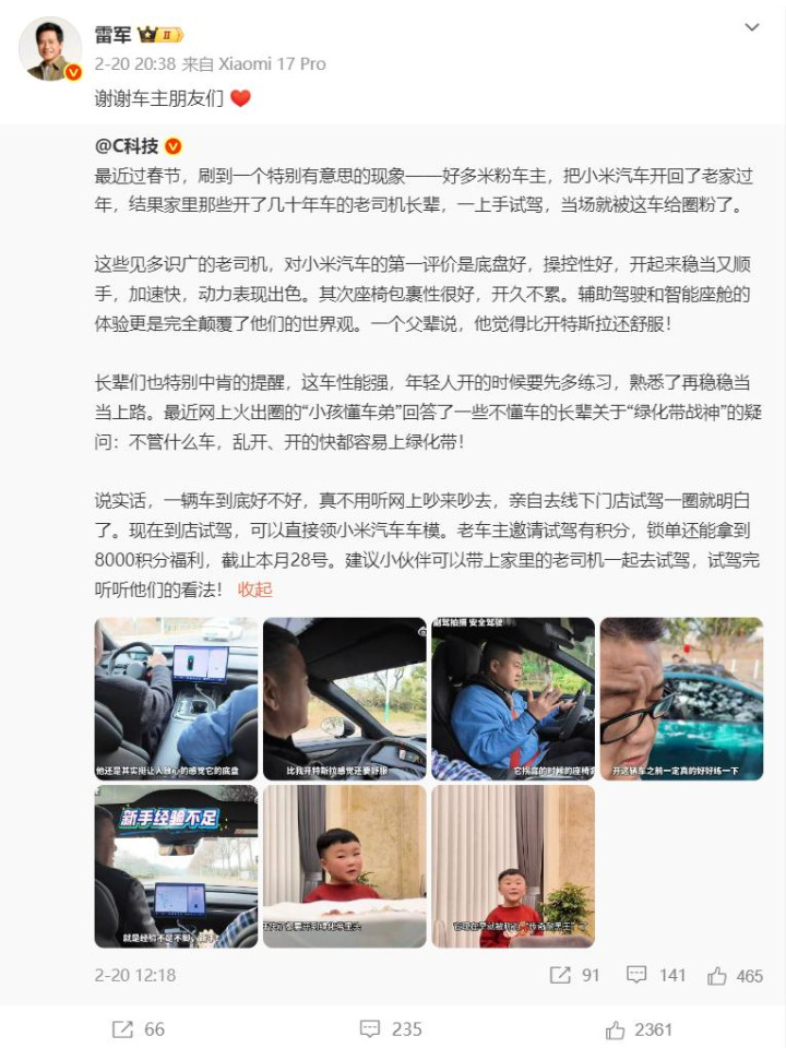 2月18日,雷军径直在微博转发了好几张车主拍摄的全家福相片,配文“小米汽车不错用车载录像头径直拍摄,为各人记载好意思好时刻”。莫得充足的营销话术,莫得吹嘘工夫,就这样简松懈单一句话。